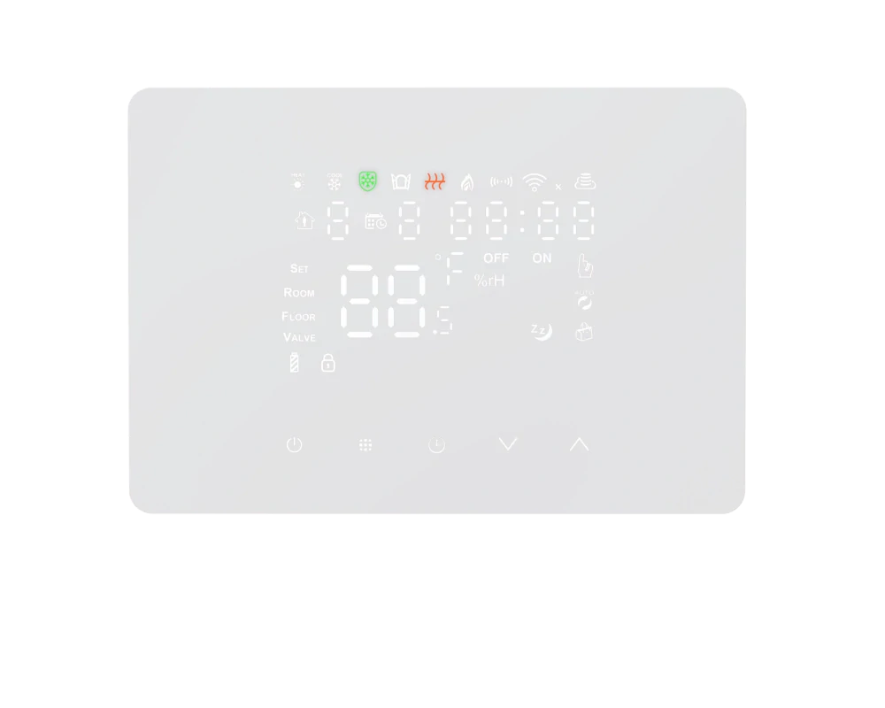 Chytrý WiFi bezdrátový prostorový termostat 16A v bílé barvě pro přímotopy. WiFi konektivita se serverem Tuya, ovládání pomocí mobilního telefonu prostřednictvím aplikace Tuya nebo Smart Life.
