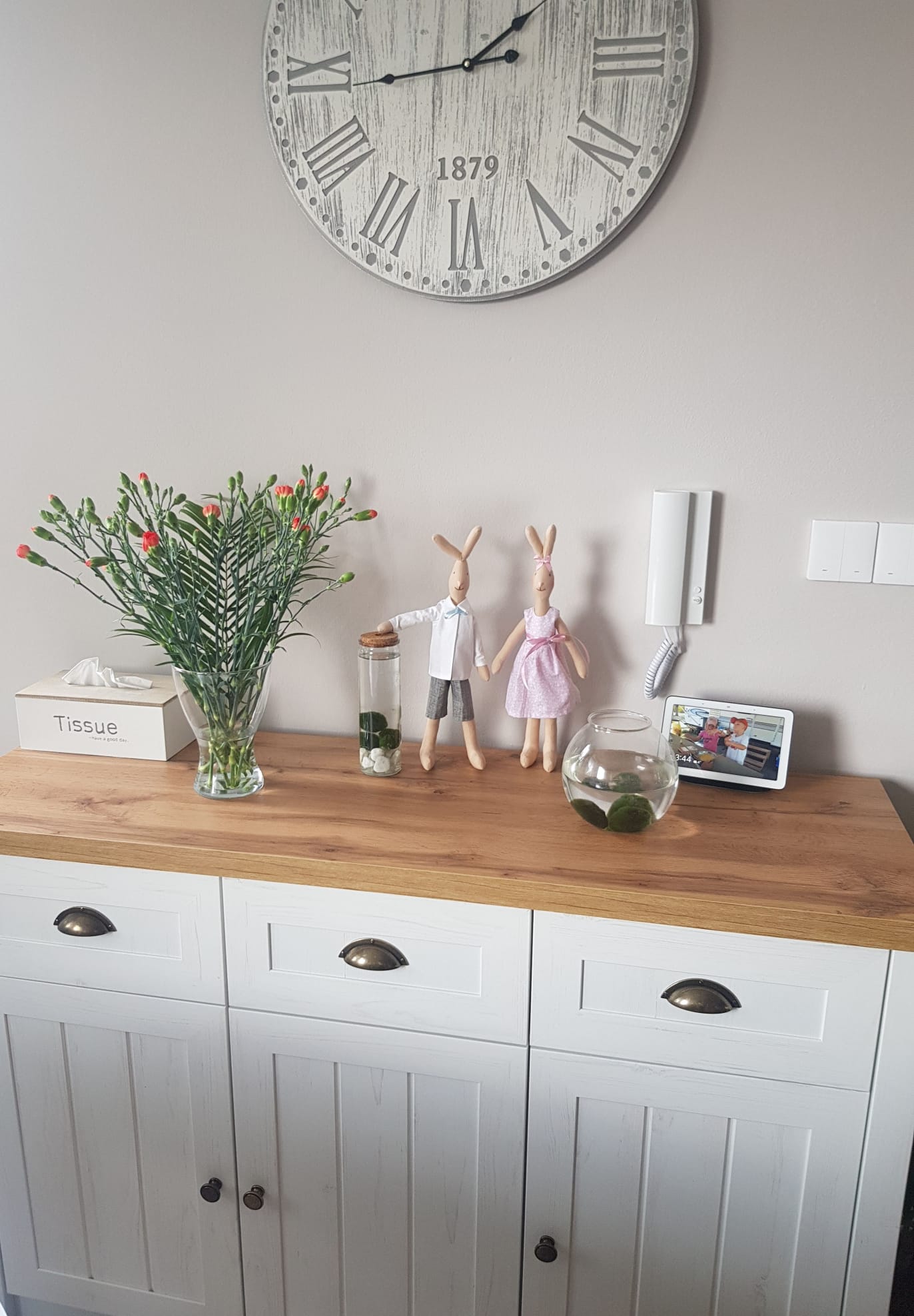 Na dobře dostupném místě, v našem případě v obývací kuchyni, máme na komodě umístěný Google Home Nest Hub, který všechny nastavené upozornění reprodukuje nahlas česky. Tohle je nastavená automatizace v Home Assistant, kde lze nastavit "řekni česky tuto hlášku v případě, že..." Zároveň tento hub slouží jako fotorámeček, takže se celá rodina, nebo jen děti u rámečku často zastaví a připomínají si fotky, které na rámečku běží. V neposlední řadě hub využíváme v kuchyni na nastavení různých časových úseků, ať už při vaření nebo na nastavení časomíry pro jakýkoliv účel. A také se Google Home Hub často ptáme na jakékoliv otázky, co bychom zrovna potřebovali vyhledat (komunikace probíhá už pouze v angličtině).