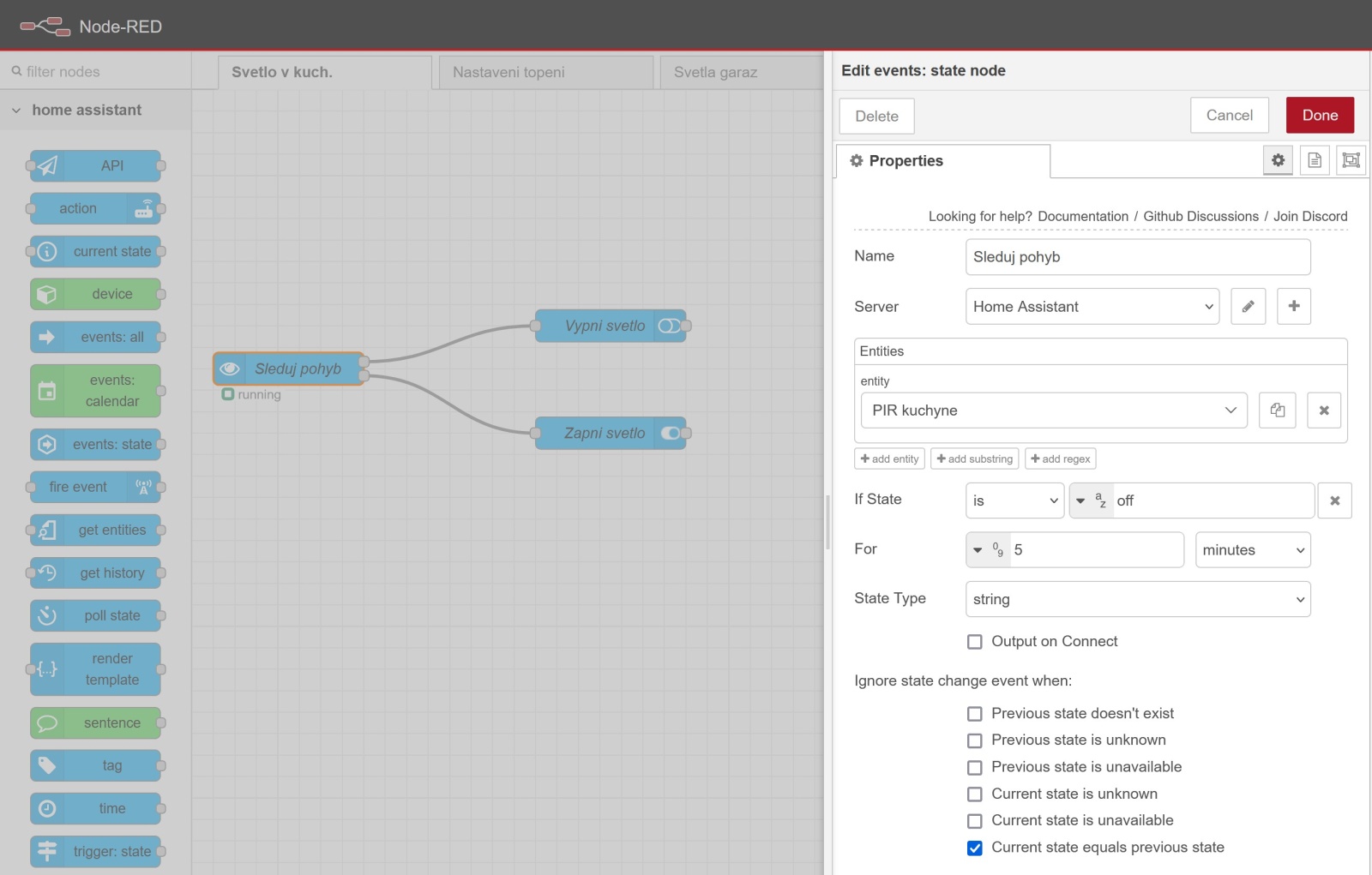 První node (uzel) sleduje stav čidla pohybu a čeká na stav "vypnuto (nevidí pohyb) po dobu 5 minut".