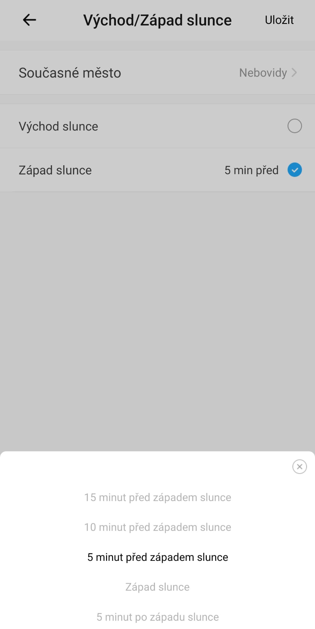 V aplikac si můžete nastavit zapnutí světel buď přesně se západem slunce, nebo spuštění scény posunout například "5 minut před západem slunce".