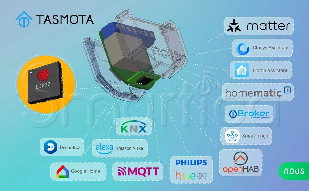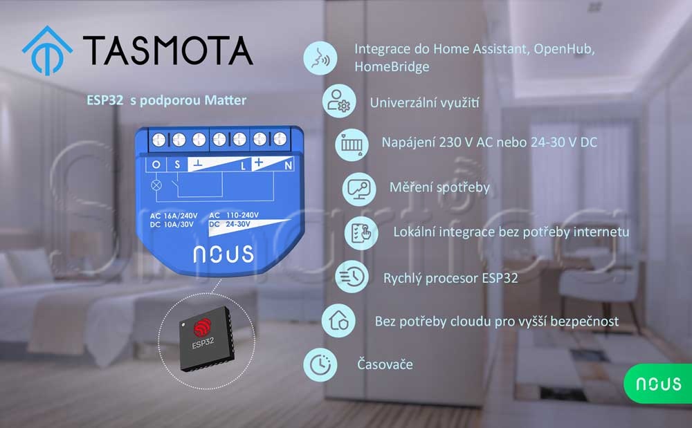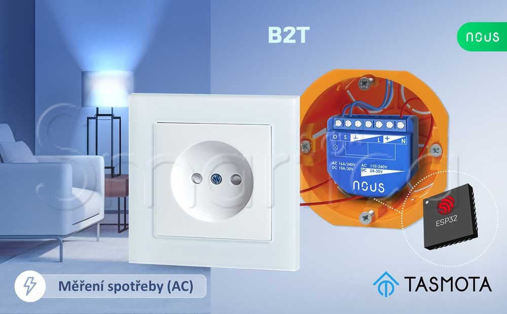 NOUS B2T je kompaktní 1kanálový spínací modul s integrovaným měřením spotřeby, určený pro montáž za běžný vypínač nebo do instalační krabice. Z výroby je osazen modulem ESP32 a už předem nahraným firmwarem Tasmota, takže je vhodný pro lokální řízení bez „povinné“ cloudové aplikace. Spínání probíhá přes relé a stav i spotřebu můžete číst a ovládat přes webové rozhraní Tasmoty, přes MQTT, nebo jej začlenit do domácí automatizace a scénářů v podporovaných systémech. Díky podpoře Matter (přes kompatibilní Matter hub) umí fungovat i v ekosystémech, které staví na standardu Matter.