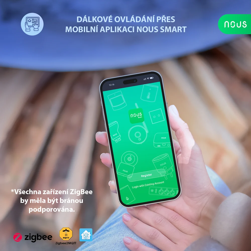 - Vyžaduje kompatibilní ZigBee bránu, například NOUS E1, NOUS E7 nebo jinou Tuya kompatibilní ZigBee bránu