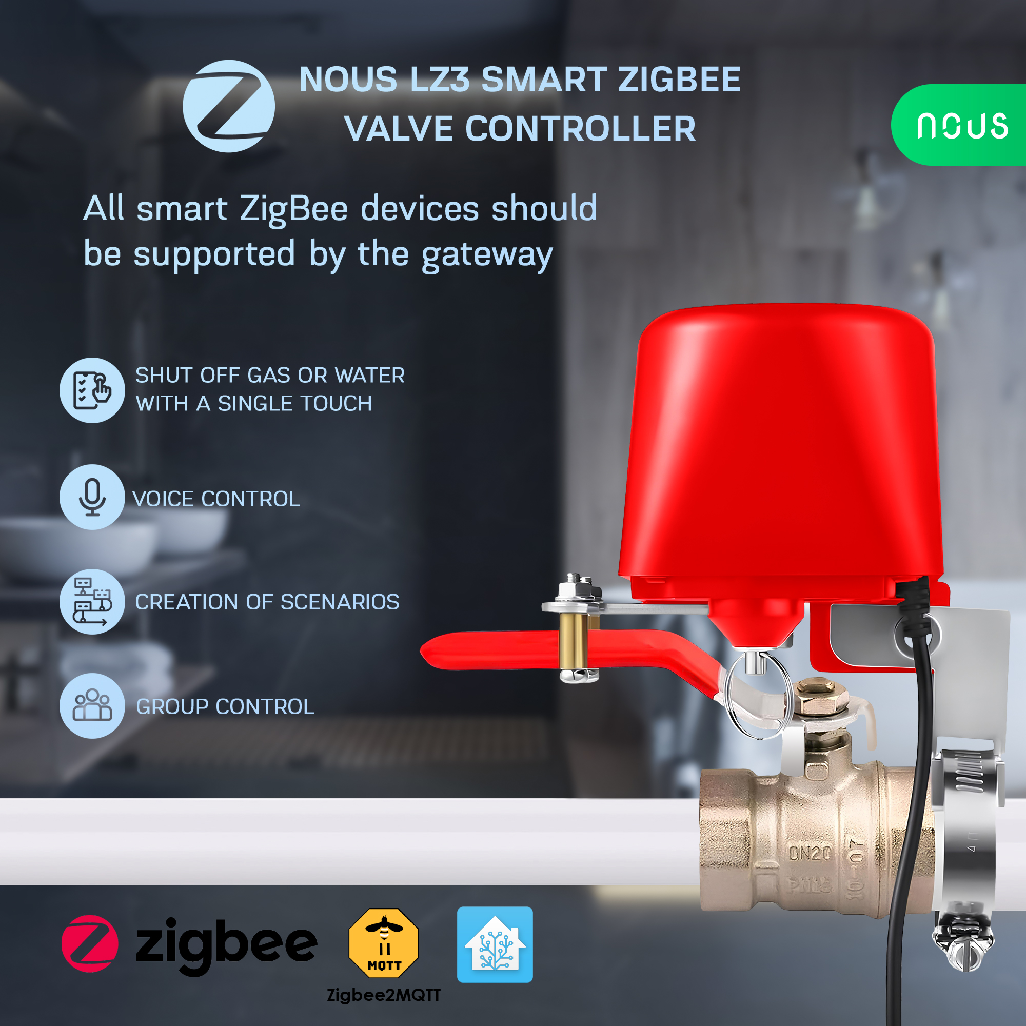 NOUS LZ3 je chytrý ZigBee ovladač kulového ventilu, který umožňuje dálkové otevření nebo uzavření vodního či plynového ventilu pomocí mobilní aplikace nebo chytré domácnosti. Zařízení se montuje na existující páku kulového ventilu a mechanicky ji otáčí, takže není nutné zasahovat do samotného potrubí. Díky tomu lze snadno automatizovat uzavření vody při úniku, ovládat zavlažování nebo vzdáleně vypnout přívod plynu. Ovladač komunikuje přes protokol ZigBee 3.0, takže je vhodný pro integraci do systémů chytré domácnosti využívajících ZigBee bránu.