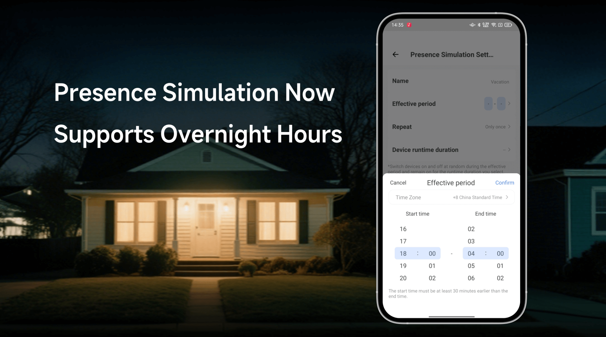 Dříve funkce Simulace přítomnosti v aplikaci eWeLink neumožňovala nastavit časové období, které přesahovalo půlnoc – například nastavení od 18:00 do 4:00 nebylo možné.