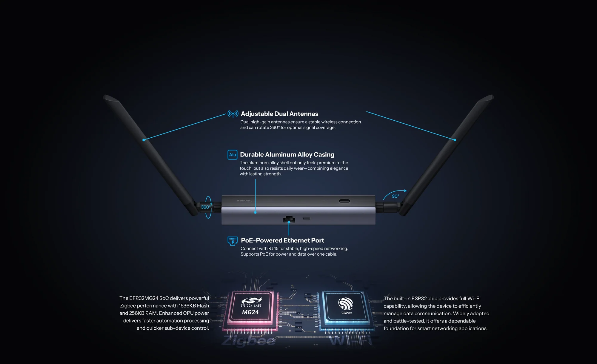 Výsledkem je zařízení, které se výrazně odlišuje od modelů ZBDongle-P a ZBDongle-E. Kromě USB připojení nabízí také Ethernet s podporou PoE a Wi-Fi. Vyšší výkon a stabilita však znamenaly i vyšší nároky na konstrukci.